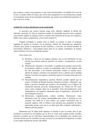 2) El documento discute el potencial de las tecnologías digitales para empoderar a las personas y fomentar la participación a través de la interacción y la democracia 2.0.