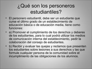 El documento describe las funciones de los personeros estudiantiles y contralores estudiantiles. Los personeros promueven los derechos de los estudiantes, reciben quejas, y apelan decisiones ante el consejo directivo. Los contralores contribuyen al buen manejo de los recursos de las instituciones educativas y reciben asesoría de la contraloría municipal. Se enfatiza la necesidad de que estos cargos se desempeñen de manera honesta y responsable.