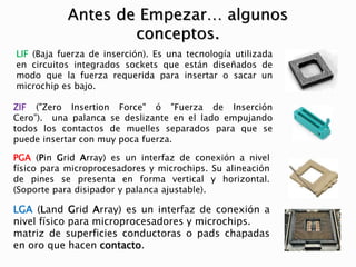 El documento describe los diferentes tipos de sockets para microprocesadores Intel, incluyendo PGA, LGA y sockets específicos como Socket 370, Socket 478 y Socket 1150. Ha habido una evolución desde sockets más antiguos con menos pines a sockets más modernos con mayor número de pines que soportan frecuencias y voltajes más altos.