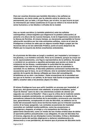 El documento resume la relación entre Sócrates y los sofistas en la Atenas del siglo V a.C. Los sofistas eran maestros pagados que enseñaban retórica y persuasión para triunfar socialmente, mientras que Sócrates buscaba la verdad y definir la virtud a través de la discusión y el cuestionamiento de las opiniones, rechazando la idea de que el conocimiento es poder o que la virtud es honores o dinero. Aunque tenían temas en común, Sócrates se oponía a la concepción so