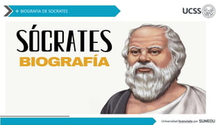 Este documento presenta un resumen biográfico de Sócrates. Nació en Atenas en el siglo V a.C. y recibió una educación tradicional antes de dedicarse a la filosofía. Sócrates creía que podía servir mejor a su país a través del diálogo y la pregunta que la política. Fue condenado a muerte por corromper a la juventud ateniense y no reconocer a los dioses del estado. Murió bebiendo cicuta a pesar de tener la oportunidad de escapar.