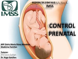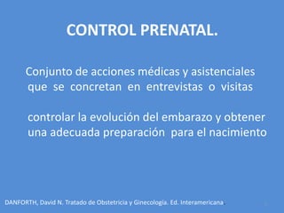 El documento describe las pautas del control prenatal para embarazos de bajo riesgo. Establece que se deben realizar al menos 5 consultas que incluyen exámenes médicos, de laboratorio y ecografías para monitorear la salud de la madre y el feto y detectar cualquier complicación. El objetivo es garantizar un embarazo y parto saludables mediante la detección oportuna de problemas y la educación de la paciente.