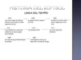 El documento presenta una línea de tiempo del softbol que describe los eventos clave en el desarrollo del deporte desde su creación en 1887 hasta la actualidad, incluyendo la invención del juego, la publicación de las primeras reglas y el establecimiento de ligas profesionales.