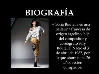 Sofia Boutella es una bailarina francesa de origen argelino que comenzó su carrera en la danza clásica y gimnasia rítmica. Más tarde se dedicó al breakdance y hip hop, ganando varias competiciones. Ha aparecido en películas, series y videos musicales como los de Madonna, y fue elegida como imagen de Nike para sus campañas de ropa deportiva femenina.