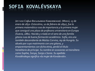 Sofia Kovalevskaya fue la primera mujer profesora de matemáticas en una universidad europea. Nació en Rusia en 1850 y demostró talento para las matemáticas desde una edad temprana, a pesar de la oposición inicial de su padre. Estudió matemáticas en Alemania y obtuvo un doctorado, siendo la primera mujer en lograrlo. Más tarde ocupó una cátedra en la Universidad de Estocolmo, donde realizó importantes contribuciones a las matemáticas antes de fallecer a los 41 años.