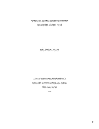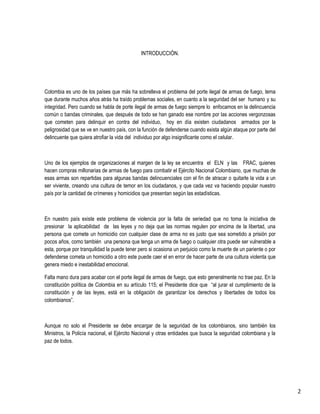 El documento aborda el problema del porte ilegal de armas de fuego en Colombia, enfatizando su contribución a la violencia y la inseguridad en el país. Se menciona la falta de aplicación de leyes y la existencia de grupos criminales que perpetúan esta problemática, así como la necesidad urgente de políticas más efectivas para controlar el tráfico y uso de armas. La autora concluye con la importancia de un cambio en la aplicación de la ley para garantizar la seguridad y la paz social en Colombia.