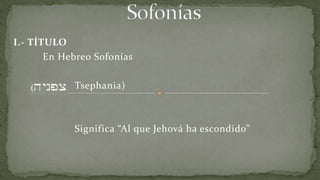 El documento resume el libro de Sofonías, incluyendo que el autor era Sofonías, bisnieto de Ezequías, que profetizó durante el reinado de Josías en Judá en el siglo 7 a.C. Advierte sobre el juicio divino que caerá sobre Judá y las naciones por su pecado, pero también habla de la restauración futura y protección de un remanente fiel.