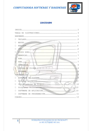 El documento describe los componentes fundamentales de hardware y software de una computadora. El hardware incluye dispositivos como el teclado, mouse, monitor, CPU, disco duro, memoria, impresora y escáner. El software se divide en software de sistema, software de aplicación y software de programación.