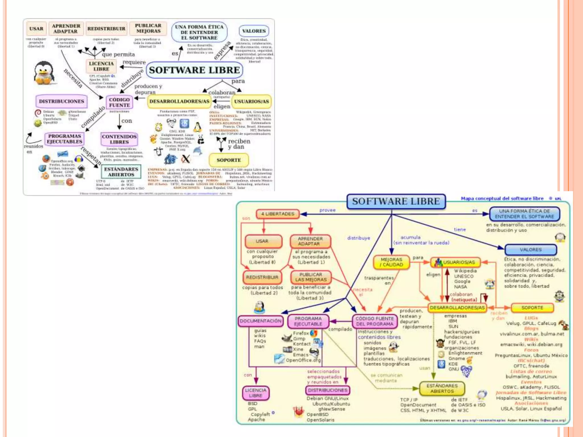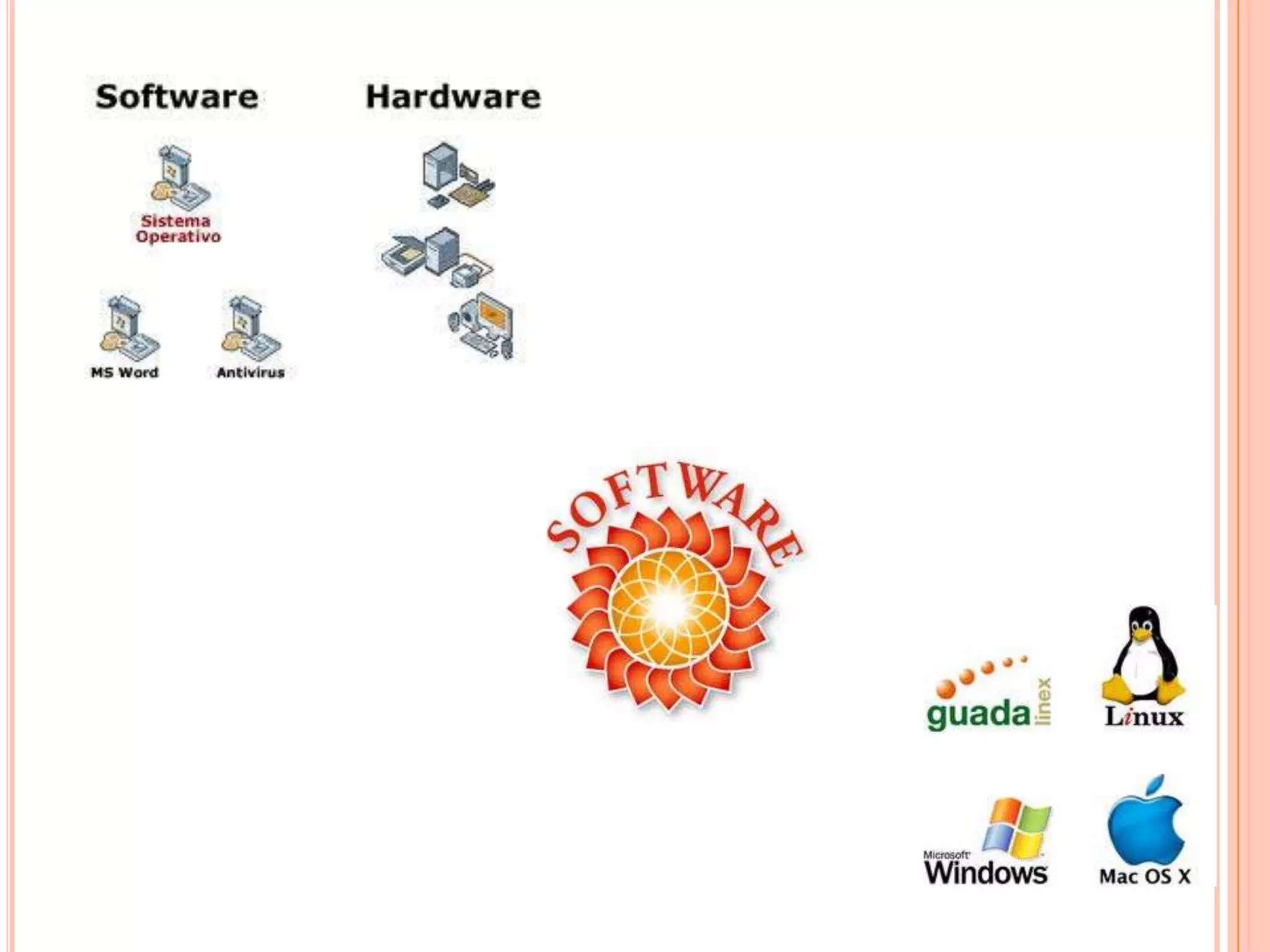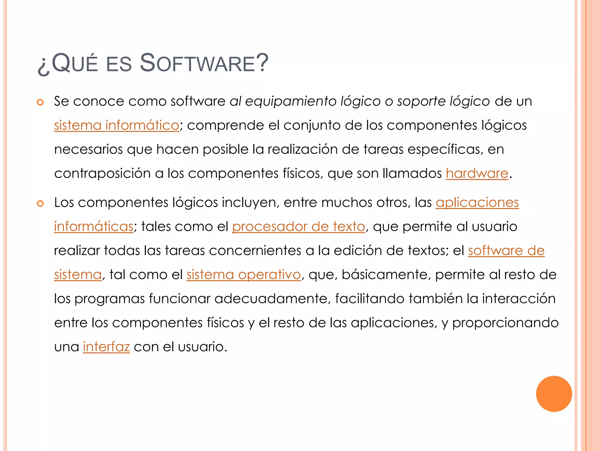 El documento define el software como el equipamiento lógico de un sistema informático que incluye aplicaciones y sistemas operativos. Explica que el software de sistema permite la interacción entre hardware y aplicaciones, mientras que el software de aplicación realiza tareas específicas. También distingue entre software libre, privativo y de programación, y describe brevemente los sistemas operativos, Unix y las licencias de software.