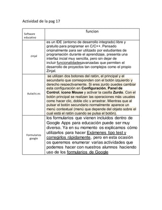 El documento presenta información sobre diferentes software educativos. Menciona Zinjal, un IDE gratuito y libre para programar en C/C++, así como Google Formularios que pueden usarse para hacer exámenes y encuestas. También describe software como PowerPoint para crear presentaciones y Derive para realizar cálculos matemáticos avanzados.