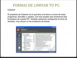 Este documento describe 5 programas para limpiar una PC: Ccleaner para limpiar archivos temporales y configurarlo para iniciar con Windows; RegSeeker, un limpiador de registro más efectivo que Ccleaner y portable; The PC Decrapifier para desinstalar programas preinstalados; Driver Cleaner para eliminar controladores no utilizados y reducir conflictos; y Windows Install Clean UP para limpiar instalaciones incompletas de Microsoft.