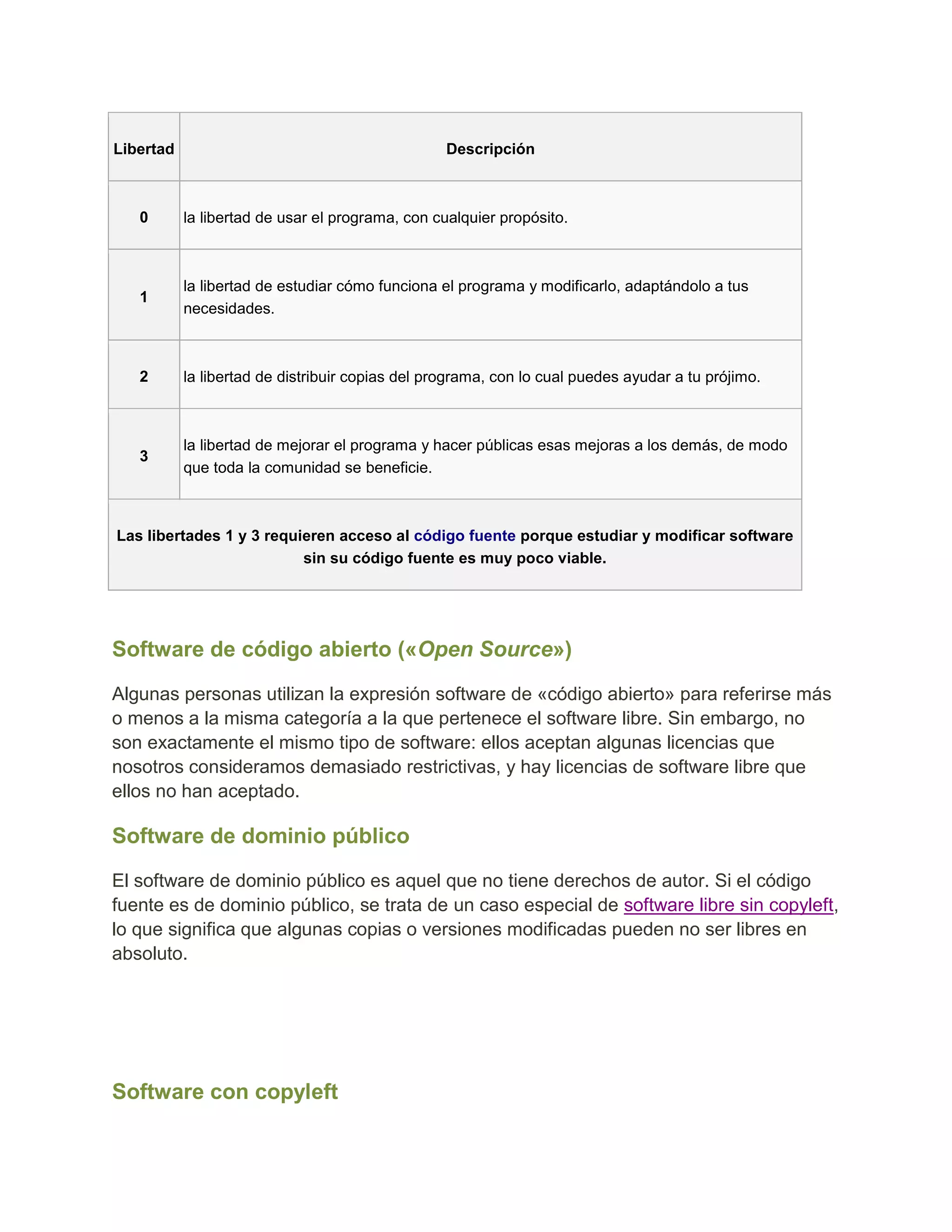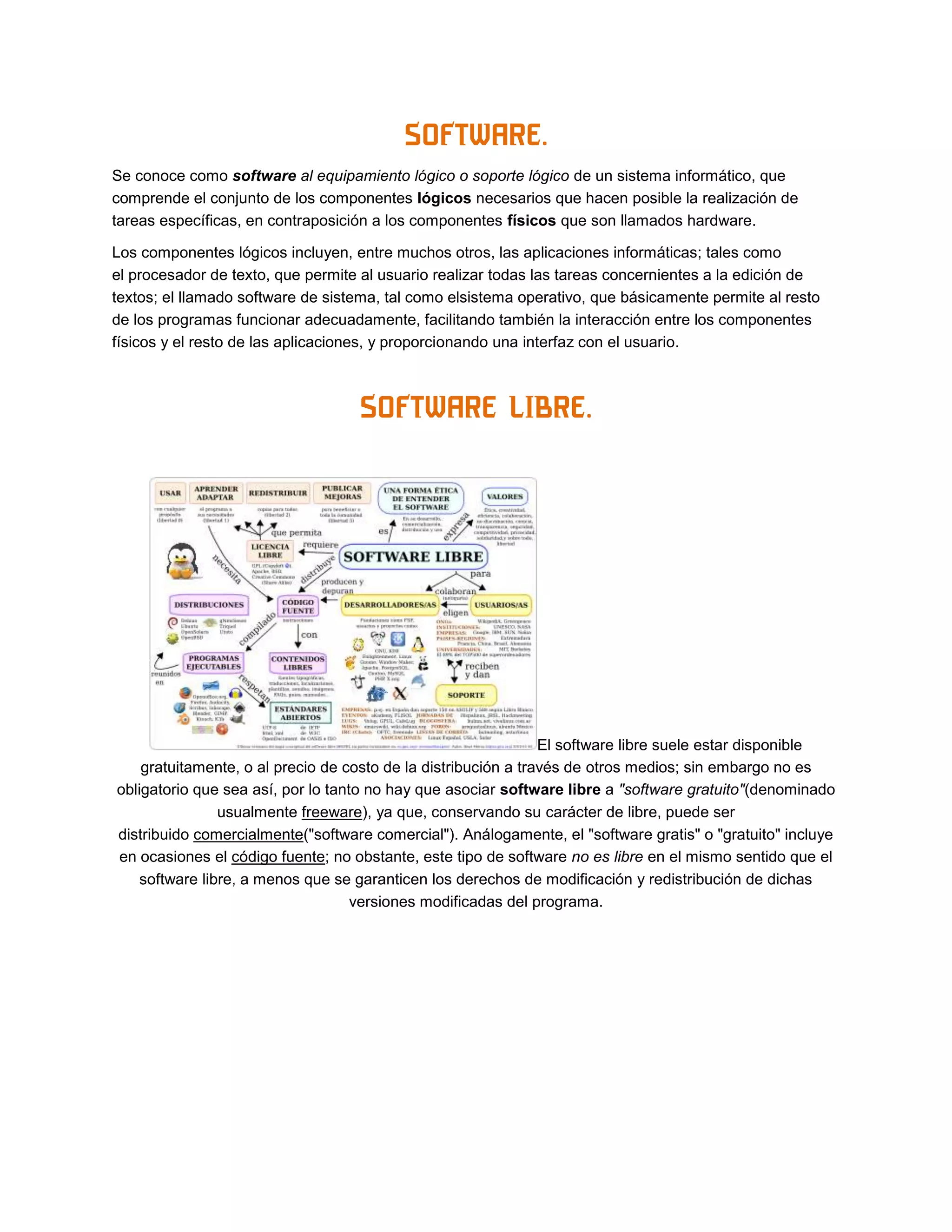 El documento habla sobre diferentes tipos de software. Explica que el software se refiere a los componentes lógicos de un sistema informático, en contraposición al hardware que son los componentes físicos. También describe brevemente el software libre, el software gratuito y diferentes tipos de licencias para software libre como copyleft.