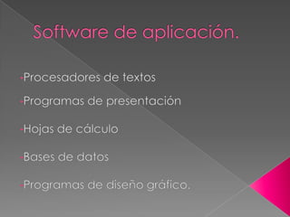 El documento describe los componentes principales de un ordenador, incluyendo la carcasa, placa base, periféricos de entrada y salida, y sistemas de almacenamiento. También explica los diferentes tipos de software como sistemas operativos, aplicaciones de productividad, herramientas de desarrollo, y programas de comunicación y seguridad.