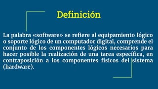 El documento define y clasifica los diferentes tipos de software. Explica que el software incluye software de sistema, software de aplicación y software de programación. Define el software de acuerdo a su uso, distribución y costo. Algunos ejemplos de software libre son Linux y Open Office.