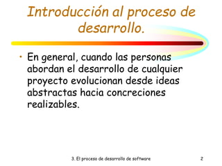 Este documento trata sobre el proceso de desarrollo de software. Explica diferentes ciclos de vida del software como el ciclo de vida clásico o en cascada, la construcción rápida de prototipos desechables y el modelo en espiral. También describe metodologías como los métodos estructurados, orientados a objetos y formales. Finalmente, introduce conceptos como la madurez del proceso en una organización según el modelo CMM.