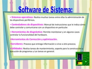 El documento describe los diferentes tipos de software, incluyendo software de sistema como sistemas operativos, controladores de dispositivos y utilidades, software de programación como editores de texto y compiladores, y software de aplicación para tareas específicas como aplicaciones de oficina y bases de datos. También explica que un computador está compuesto de hardware y software, y que el software se divide en software de sistema, programación y aplicación.
