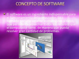 El software es un ingrediente indispensable para el funcionamiento del computador y está formado por instrucciones y datos que permiten al computador resolver problemas. El software se clasifica en sistemas operativos, controladores de dispositivo, herramientas de diagnóstico, herramientas de corrección y optimización, servidores y utilidades.