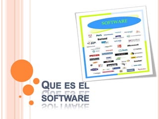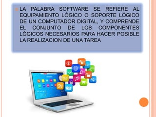 El documento describe los tres tipos principales de software: software de sistema, software de programación y software de aplicación. El software de sistema proporciona interfaces y herramientas para el mantenimiento del sistema. El software de programación incluye editores, compiladores e intérpretes que permiten a los programadores desarrollar software. El software de aplicación permite a los usuarios realizar tareas específicas en campos como negocios, educación, medicina y más.