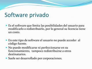 El documento compara software privado y libre, explicando que el primero restringe modificaciones y redistribución, mientras que el segundo promueve la libertad de uso y acceso al código fuente. También se evalúan diferentes computadoras para diseño y comparan sistemas operativos como Windows, Mac y Linux, resaltando sus ventajas y desventajas. Se concluye que es crucial entender las opciones disponibles para tomar decisiones informadas sobre software y sistemas operativos en función de las necesidades del usuario.