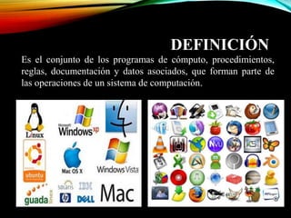 DEFINICIÓN Es el conjuntode los programas de cómputo, procedimientos, reglas, documentación y datos asociados, que forman parte de las operaciones de un sistema de computación.