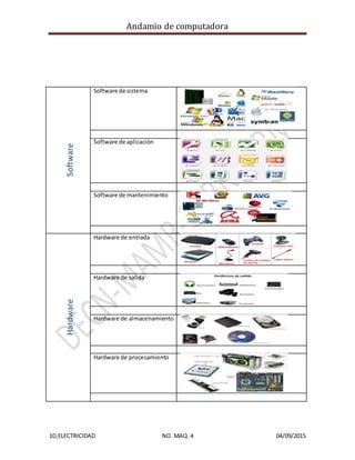 El documento clasifica los componentes de una computadora en software y hardware. El software incluye software de sistema, software de aplicación y software de mantenimiento, mientras que el hardware se divide en hardware de entrada, salida, almacenamiento y procesamiento.