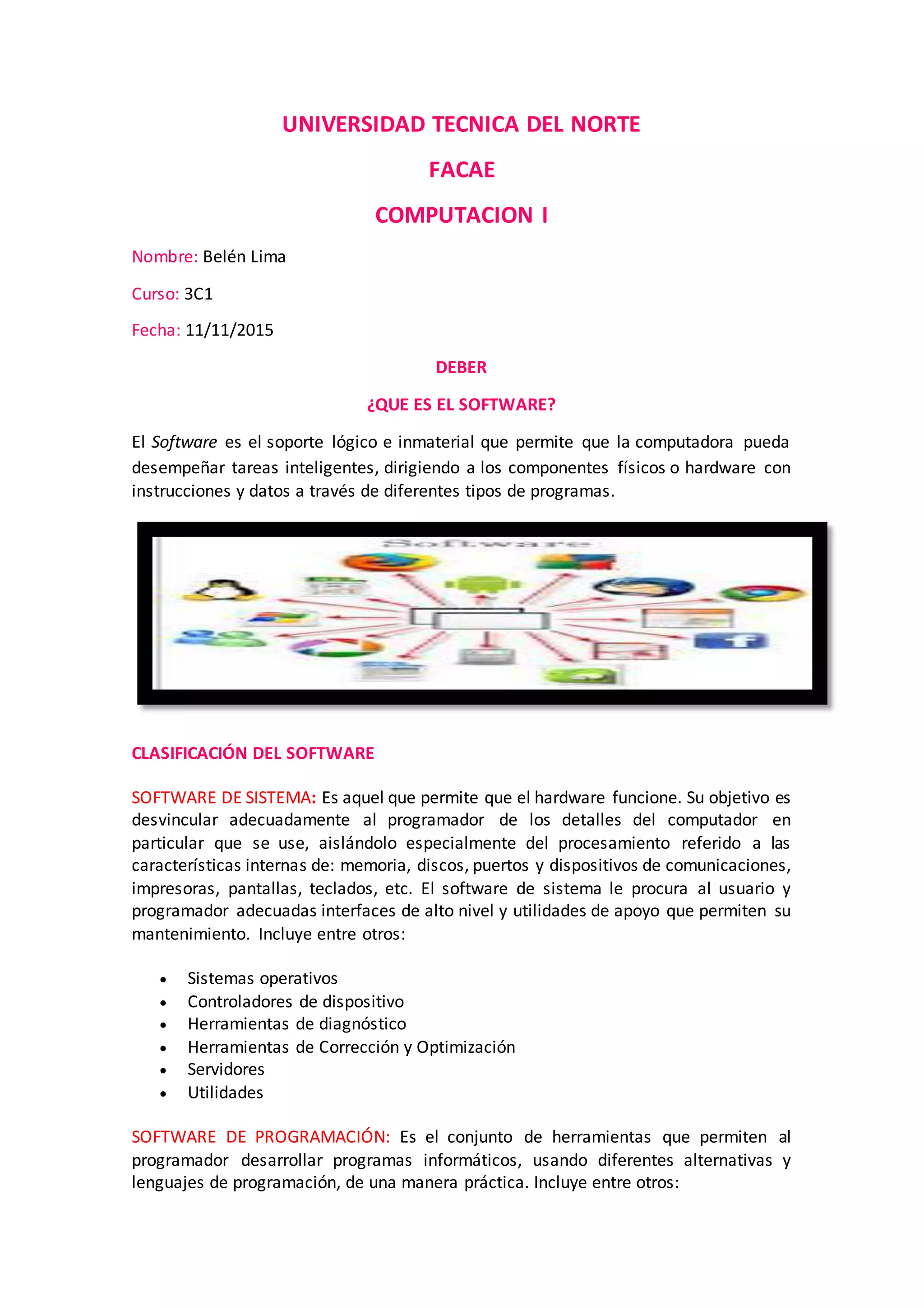 El documento explica qué es el software, clasificándolo en tres categorías principales: software de sistema, software de programación y software de aplicación. Cada tipo se describe con sus funciones, ejemplos y su importancia en la interacción entre el usuario y la computadora. Además, se aborda la diferencia entre software libre y propietario, y se menciona el concepto de malware.