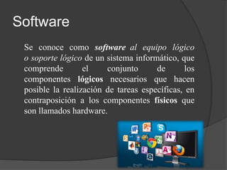 El software se refiere a los componentes lógicos de un sistema informático, en contraposición al hardware que son los componentes físicos. El software de sistema permite aislar al usuario de los detalles internos del sistema como la memoria y dispositivos. Existen diferentes tipos de software como el de aplicaciones, programación y sistemas operativos, que pasan por etapas de desarrollo, pruebas y mantenimiento.
