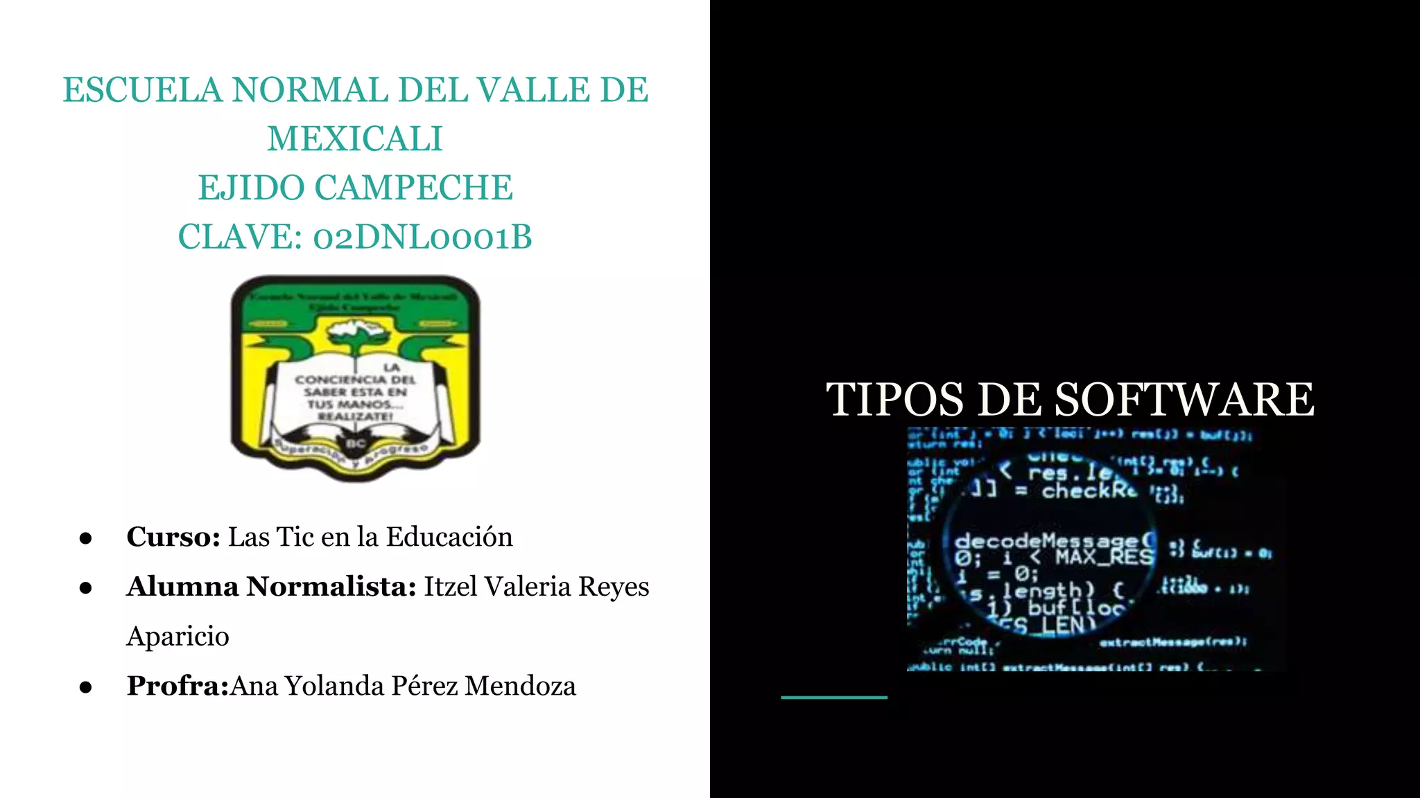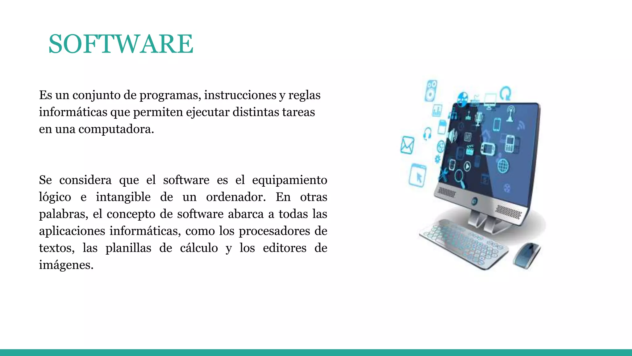 El documento describe tres tipos principales de software: software de aplicación, que permite a los usuarios realizar tareas específicas como procesamiento de texto y hojas de cálculo; software de programación, que son herramientas para desarrollar programas informáticos usando lenguajes de programación; y software de sistema, que permite a los usuarios interactuar y controlar el sistema operativo, administrando los recursos del hardware y proporcionando una interfaz de usuario. Ejemplos de cada tipo de software se proporcionan.