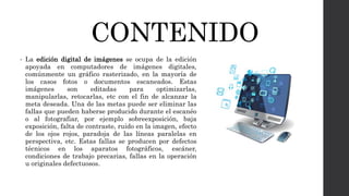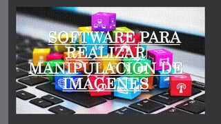 Este documento habla sobre diferentes programas de software para editar imágenes digitales. Describe brevemente las funciones de Polarr, GIMP, Photoshop, Inkscape, Queeky y Hexels, que son algunos de los programas más populares para manipular y retocar imágenes. También incluye una sección de bibliografía con enlaces a más información.