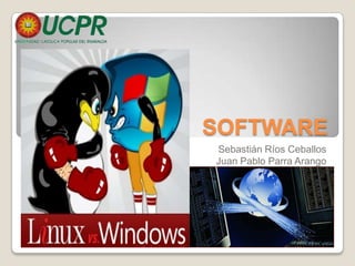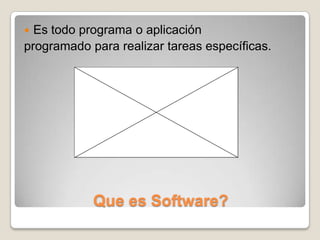 El documento define el software como cualquier programa o aplicación diseñada para realizar tareas específicas. Explica que el software incluye el código del programa, la documentación de diseño y los requisitos. También describe los dos tipos principales de software: los sistemas operativos, que controlan las operaciones del computador, y el software de aplicación, que permite realizar tareas específicas. Además, menciona que los tres sistemas operativos más importantes son Windows, MacOS y Linux.