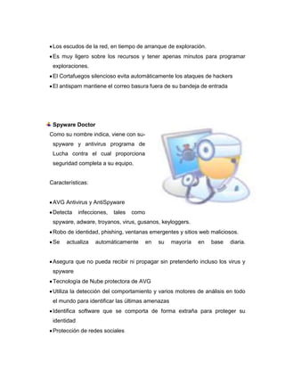 El documento proporciona información sobre diferentes software antivirus libres y con licencia, incluyendo ClamWin, Avast, Spyware Doctor, BitDefender, Panda Antivirus, Avira AntiVir, ESET NOD32 Antivirus y AVG PC Tuneup. Para cada uno se describen sus características principales como detección de virus y spyware, actualizaciones automáticas, protección en tiempo real, escudos de red, protección de identidad y bajo consumo de recursos. El documento finaliza con una bibliografía de sitios web sobre antivirus.