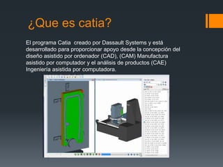 El documento describe el uso del software CATIA, diseñado para el diseño asistido por ordenador (CAD), manufactura asistida por computador (CAM) y análisis de ingeniería asistida por computadora (CAE). Se detallan las fases del desarrollo de productos y la implementación del software en la fabricación de utillaje para la producción de grifería sanitaria mediante el proceso de forjado. Finalmente, se menciona la selección de materiales, el proceso de diseño y simulación en CATIA para optimizar la producción.