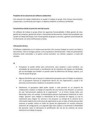 El brainstorming electrónico es una variante del tradicional que permite a los participantes aportar ideas sin turnos y evita la interferencia cognitiva. Los grupos de discusión online facilitan reunir expertos a distancia y ofrecen ventajas como ahorro y rapidez. Los sistemas de workflow automatizan los procesos de trabajo colaborativo mediante la descripción de tareas en serie o paralelo para lograr un objetivo común.