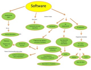 Existen 3 tipos de software: sistema, de programación y de aplicación. El software sirve para realizar tareas específicas y es un conjunto de herramientas y programas diseñados para apoyar y controlar el hardware de un sistema informático, gestionando recursos como la memoria y el espacio en disco, y facilitando la manipulación de la computadora para y por los usuarios a través de programas como compiladores, intérpretes, ensambladores, montadores, cargadores, depuradores y trazadores, así como aplicaciones gráficas y de bases de