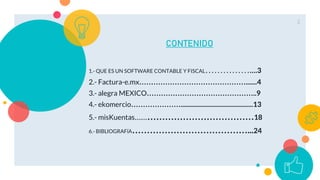 Este documento describe y compara varios softwares contables y fiscales disponibles en México. Explica brevemente las funciones de cada software, incluyendo Factura-e.mx, alegra MEXICO, ekomercio y misKuentas. Los softwares ofrecen funciones como facturación electrónica, contabilidad electrónica, declaraciones fiscales y más, para automatizar y simplificar los procesos contables y fiscales de las empresas.
