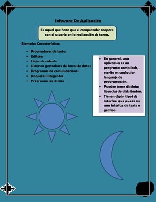El documento describe el software de aplicación como programas que permiten a los usuarios realizar tareas específicas como procesar texto, editar, usar hojas de cálculo, gestionar bases de datos y comunicarse. Las aplicaciones generalmente son programas compilados escritos en cualquier lenguaje de programación y tienen interfaces de texto o gráficas.