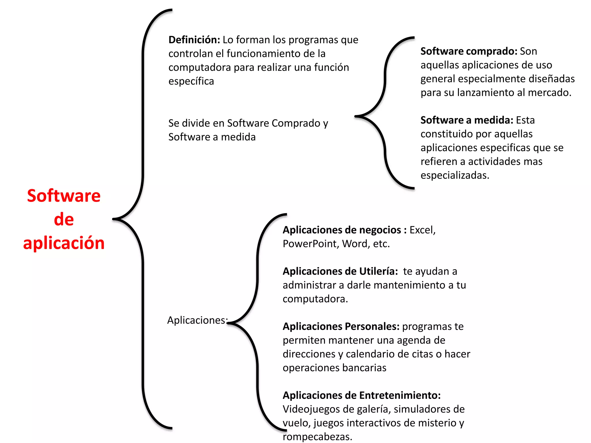 El software se divide en software comprado y software a medida. El software comprado son aplicaciones de uso general diseñadas para su venta comercial, mientras que el software a medida son aplicaciones específicas para actividades más especializadas. Existen también diferentes tipos de aplicaciones como de negocios, utilería, personales y entretenimiento.