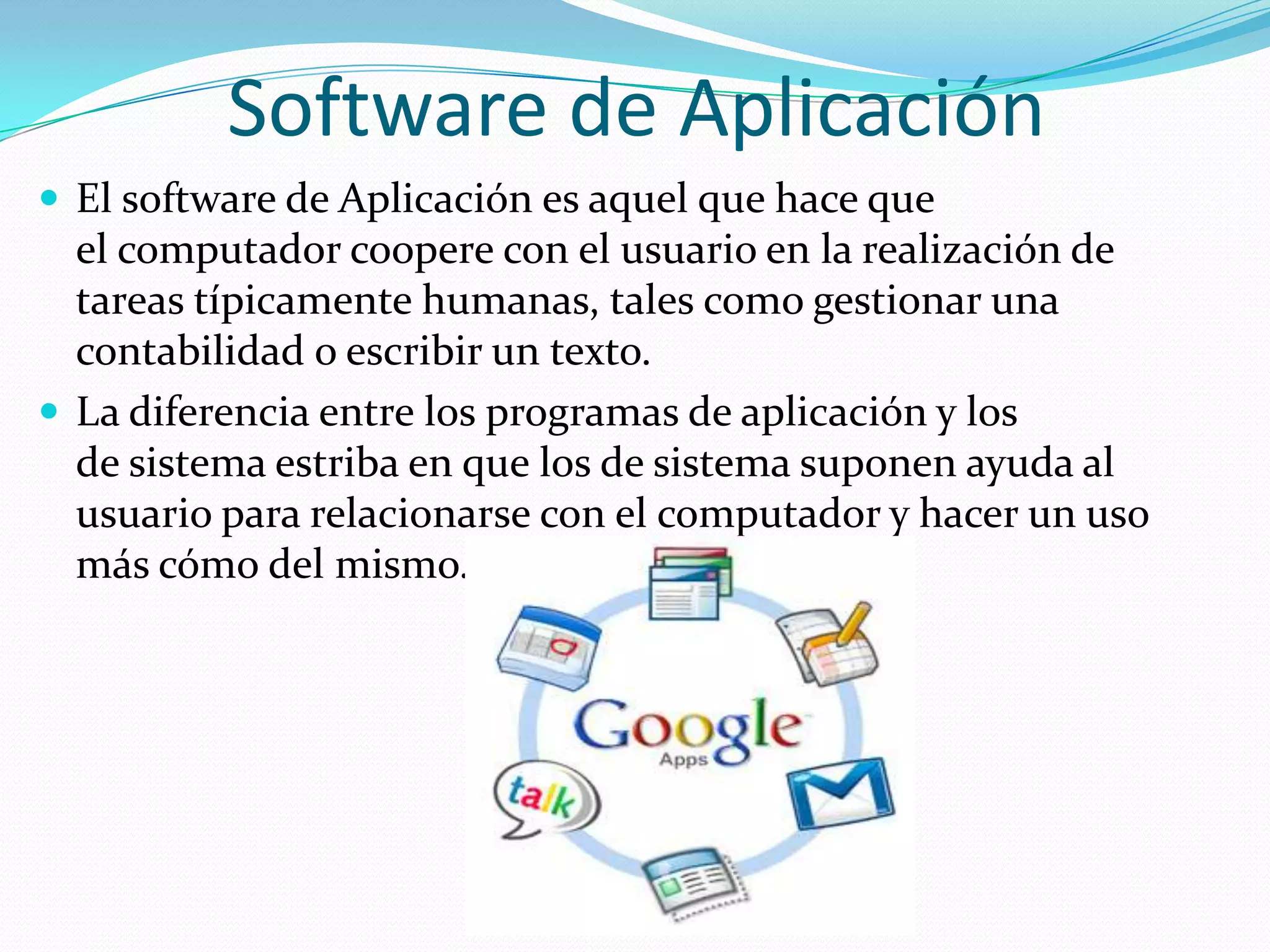 El documento describe diferentes tipos de software de aplicación, incluyendo software de negocio para operaciones básicas, aplicaciones domésticas para entretenimiento y educación, aplicaciones profesionales generales para gestionar procesos empresariales, y software de utilidades como antivirus y motores de búsqueda.