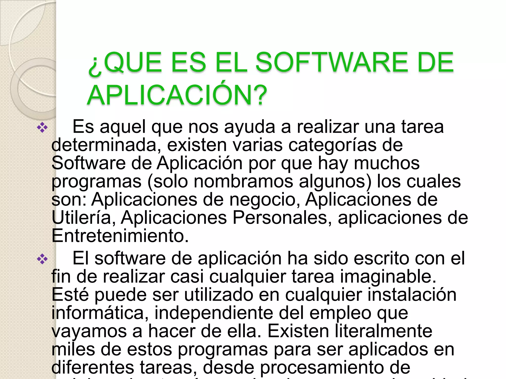 El documento habla sobre los diferentes tipos de software de aplicación, incluyendo aplicaciones de negocios, utilerías, personales y entretenimiento. Explica que el software de aplicación se utiliza para realizar tareas específicas a diferencia del software de sistema, que ayuda al usuario a interactuar con la computadora. Además, proporciona ejemplos de aplicaciones populares en cada categoría como procesadores de texto, hojas de cálculo y videojuegos.