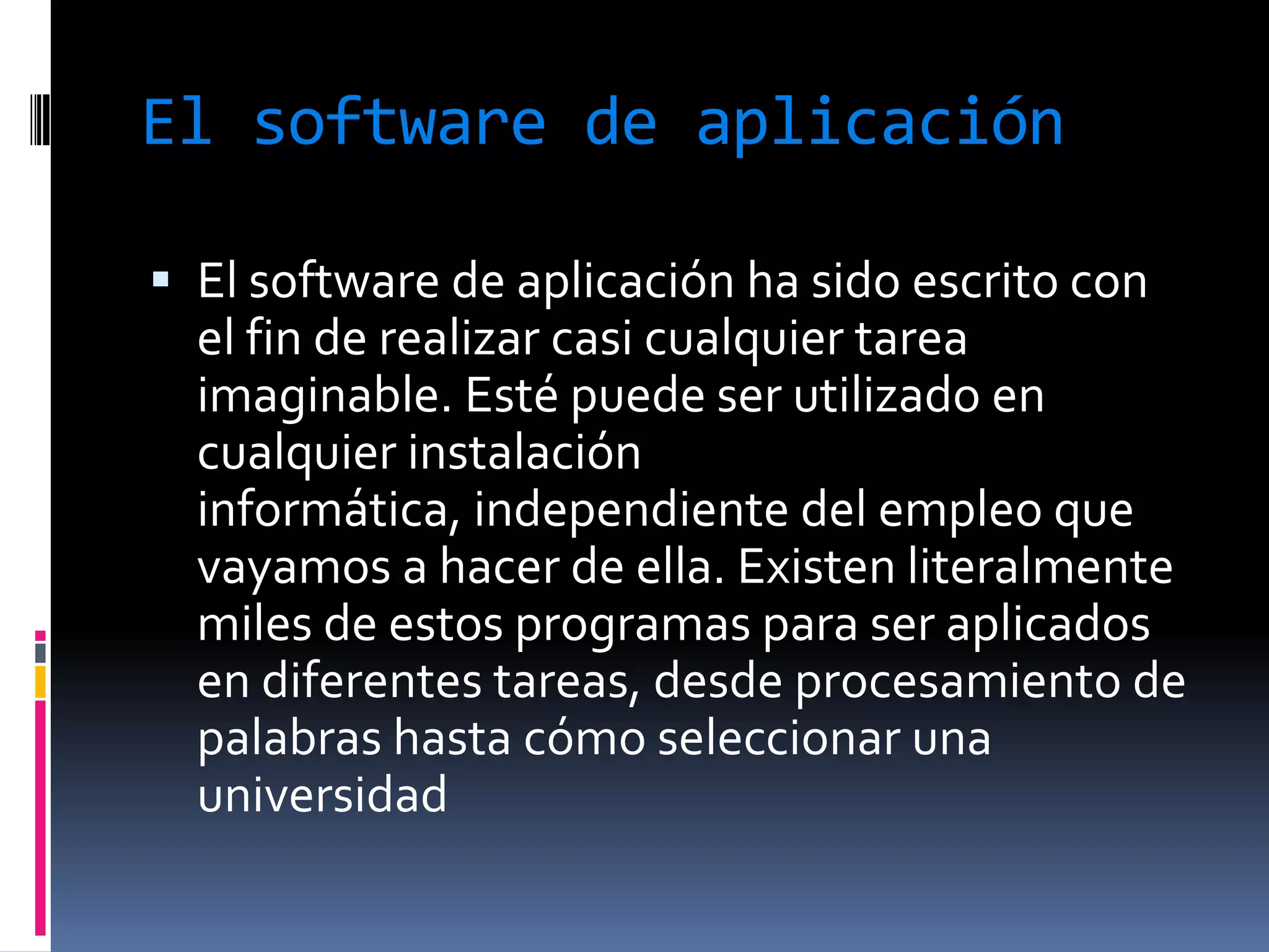 El software de aplicación puede utilizarse para realizar casi cualquier tarea y se divide en cuatro categorías: aplicaciones de negocios como procesadores de palabras y hojas de cálculo, aplicaciones de utilería para administrar la computadora, aplicaciones personales como agendas y banca en línea, y aplicaciones de entretenimiento como videojuegos y simuladores.