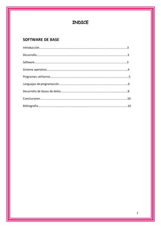 Este documento proporciona información sobre el software de base, incluyendo sistemas operativos, programas utilitarios y lenguajes de programación. Explica que el software de base controla e interactúa con el sistema para administrar recursos de hardware y dar soporte a otros programas. También describe algunos sistemas operativos populares como DOS y Windows, ejemplos de programas utilitarios, y niveles de lenguajes de programación como de bajo y alto nivel. El objetivo general es comprender los conceptos clave del software fundamental que hace funcionar un sistema computacional