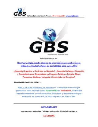 GBS es la casa colombiana de software número 1 en innovación. Ofrece software de contabilidad para pymes llamado Software GBS que permite organizar y controlar fácilmente todos los aspectos del negocio. El software automatiza tareas administrativas, brinda información para mejorar las decisiones empresariales y es más barato que otros productos similares.