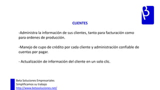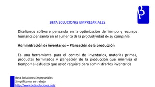 Beta Soluciones Empresariales ofrece software para administrar inventarios, clientes, proveedores, artículos, pedidos de producción, facturación y más, con el fin de optimizar recursos, aumentar la productividad y simplificar las tareas empresariales. El software permite controlar stocks, gestionar datos de clientes y proveedores, generar órdenes y facturas, entre otras funciones clave para la gestión empresarial.