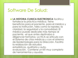Este documento describe un software de salud que facilita la práctica médica a través de la historia clínica electrónica. El software proporciona una forma rápida y fácil de acceder y registrar datos de pacientes, recetas y órdenes médicas. También incluye herramientas como protocolos de tratamiento, guías preventivas y alertas para resultados anormales que ayudan a los médicos en la toma de decisiones. El software puede ser accedido desde cualquier lugar a través de dispositivos móviles, permitiendo a los