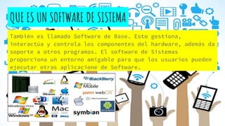 El documento describe los componentes clave de un sistema de software, incluyendo el software del sistema, los sistemas operativos como Windows, Linux y MacOS, y programas utilitarios como antivirus. Explica que el software del sistema gestiona los componentes de hardware y proporciona un entorno para otras aplicaciones, mientras que los sistemas operativos administran los recursos de la computadora y controlan su funcionamiento.