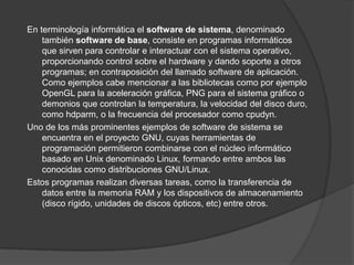 El documento habla sobre el software de sistema. Explica que es el software que controla el hardware y soporta otros programas, a diferencia del software de aplicación. Da ejemplos como bibliotecas y demonios. También describe los tipos de software de sistema como sistemas operativos, controladores de dispositivos y herramientas de programación. Finalmente, explica brevemente algunos sistemas operativos comunes como Windows, Linux y Mac OS.