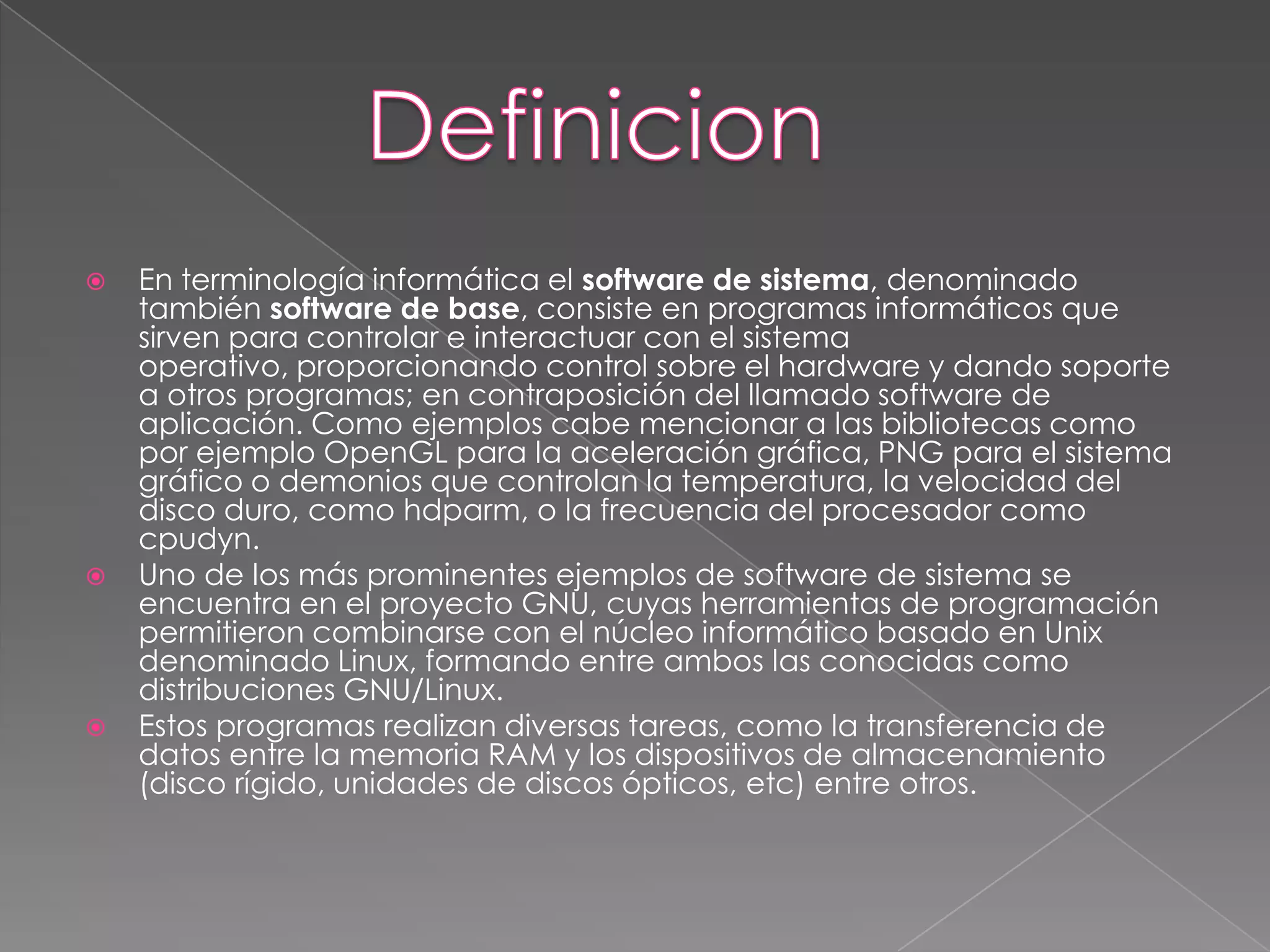 El software de sistema incluye programas que controlan e interactúan con el sistema operativo y hardware, como bibliotecas gráficas y controladores de dispositivos. Ejemplos prominentes son las herramientas de GNU que se combinan con el núcleo Linux para formar distribuciones GNU/Linux. El software de sistema se clasifica en sistema operativo, controladores de dispositivos y programas utilitarios, e incluye cargadores de programas, sistemas operativos, herramientas de programación y más.
