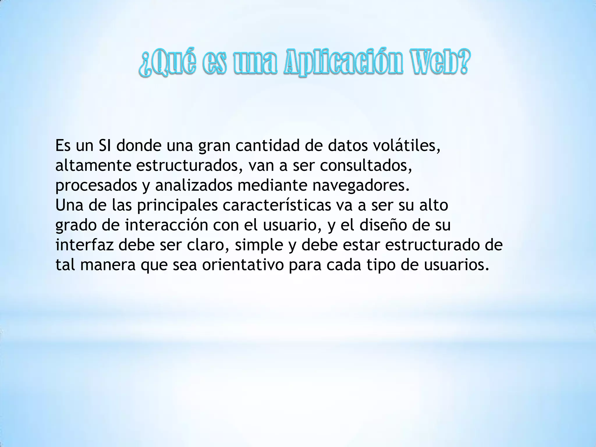Este documento describe los principios y disciplinas de la ingeniería de software orientada a la web. Explica que la ingeniería de software orientada a la web se ocupa del desarrollo, implementación y mantenimiento de aplicaciones y sistemas basados en la web mediante la aplicación sistemática de principios de ingeniería. También describe las fases del desarrollo web, incluido el análisis de requisitos, diseño conceptual, diseño de navegación y diseño de presentación.