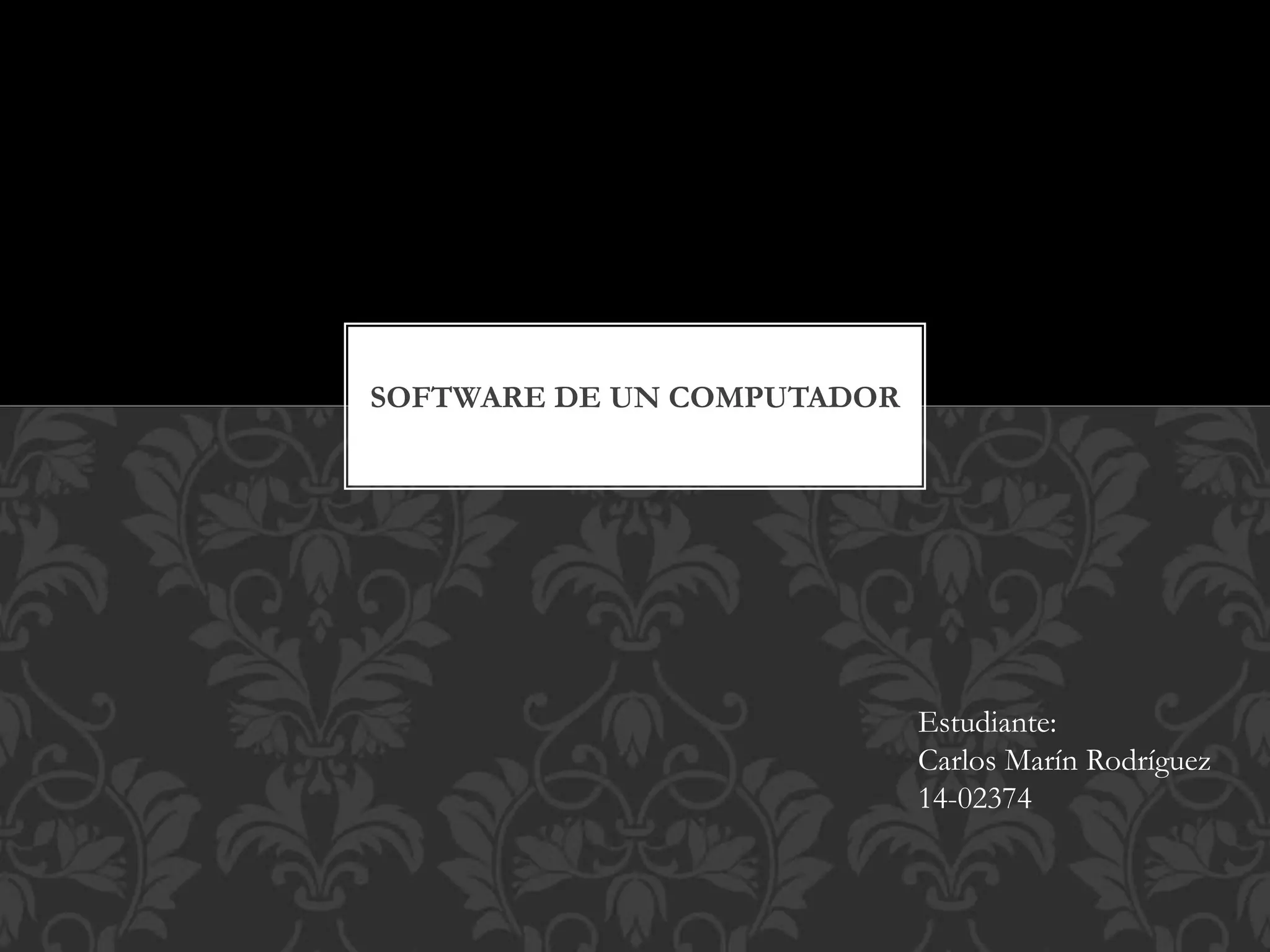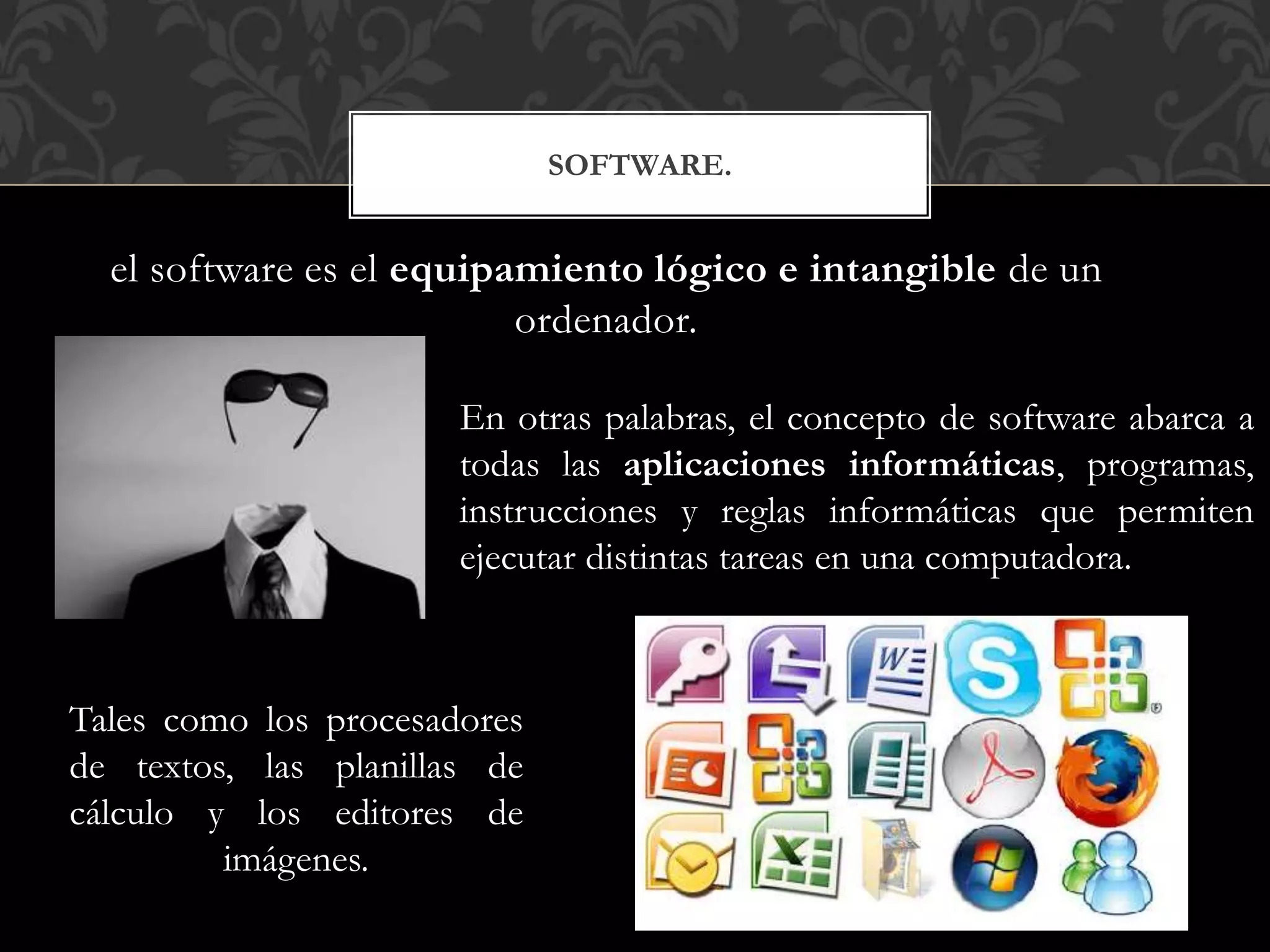 El software es el equipamiento lógico e intangible de un ordenador que incluye aplicaciones, programas e instrucciones que permiten ejecutar tareas. Los softwares se pueden clasificar en tres tipos: software de sistema, software de programación y software de aplicación. El software de sistema incluye el sistema operativo y servidores, el software de programación incluye enlazadores y compiladores, y el software de aplicación incluye software educativo, médico y de telecomunicaciones.