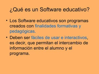 Este documento describe las características de un software educativo efectivo. Un software educativo debe ser interactivo y fácil de usar, con el objetivo de cumplir funciones como la instrucción, expresión, investigación e innovación. Un software es eficiente cuando es fácil de usar e instalar, fomenta el autoaprendizaje, usa tecnología avanzada y requiere esfuerzo cognitivo, además de contar con materiales audiovisuales de calidad y coincidir con el enfoque pedagógico vigente. Para que la enseñ